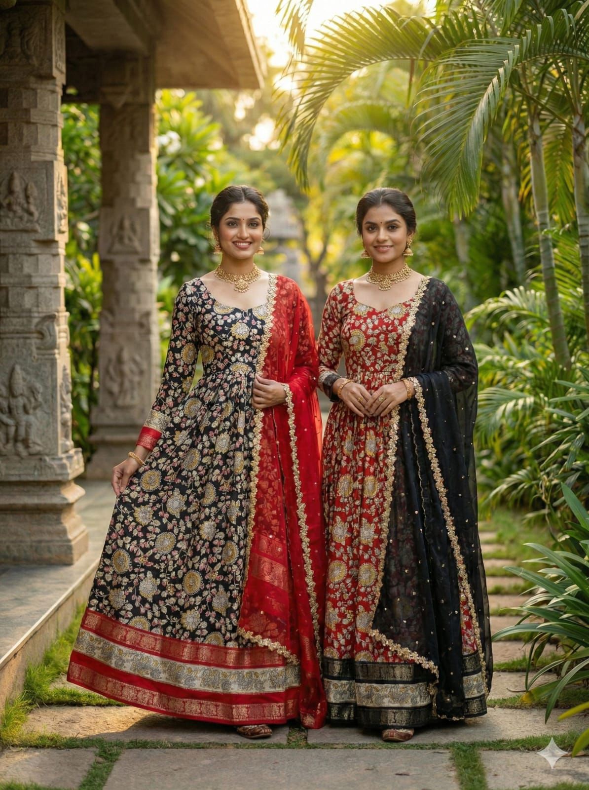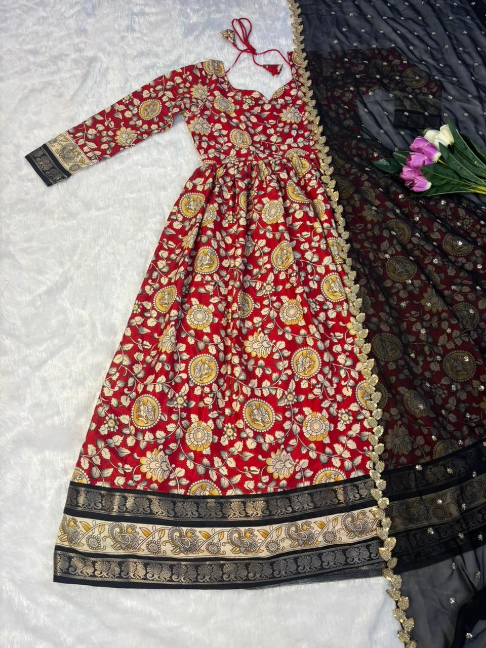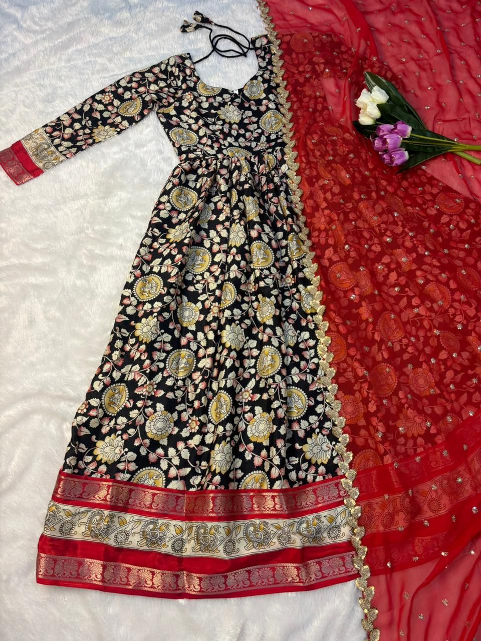 GOWN :- HEAVY SOFT DOLA SILK KALAMKARI PRINTED  FABRIC WITH  JECARED  BORDER ALONG  WITH FULL INNER