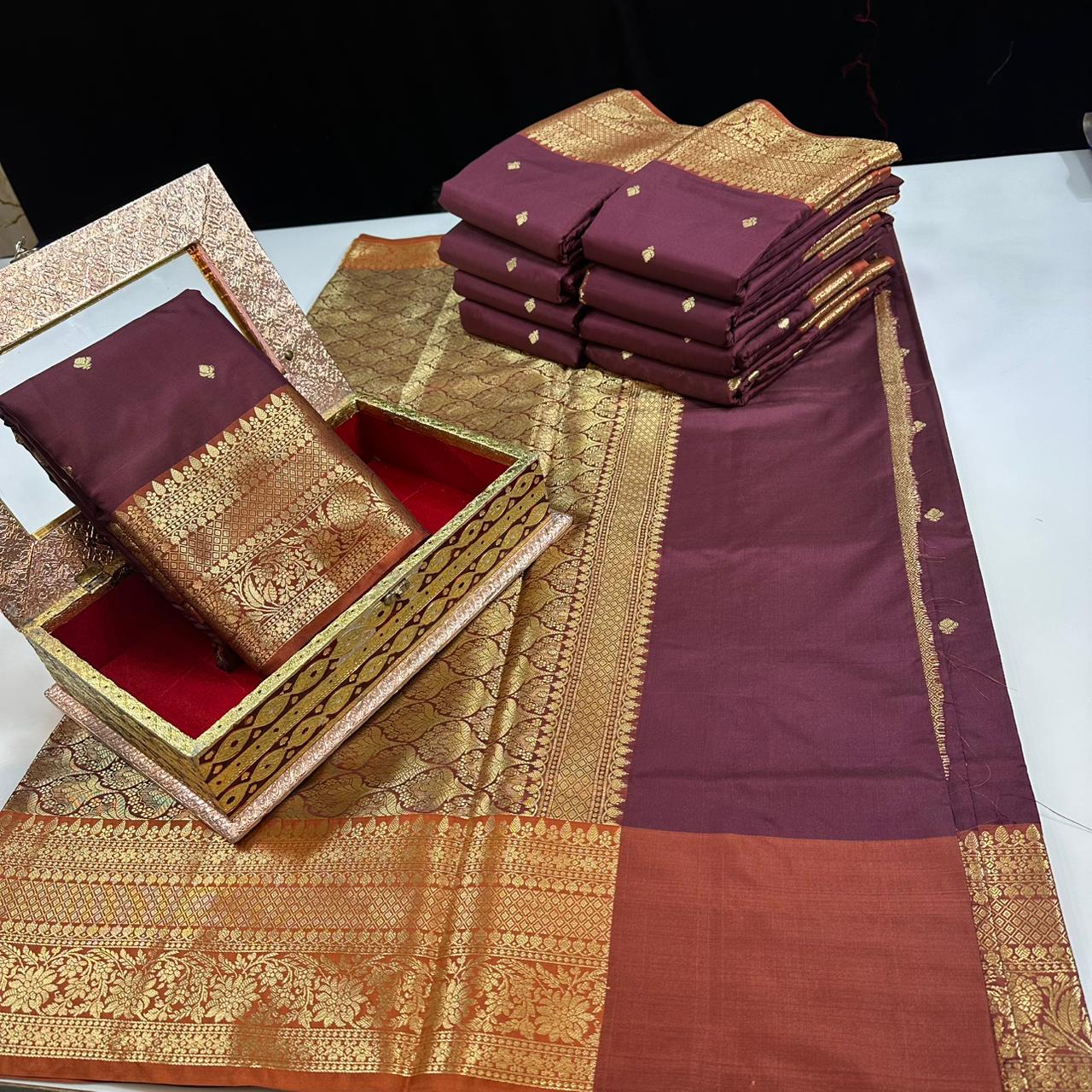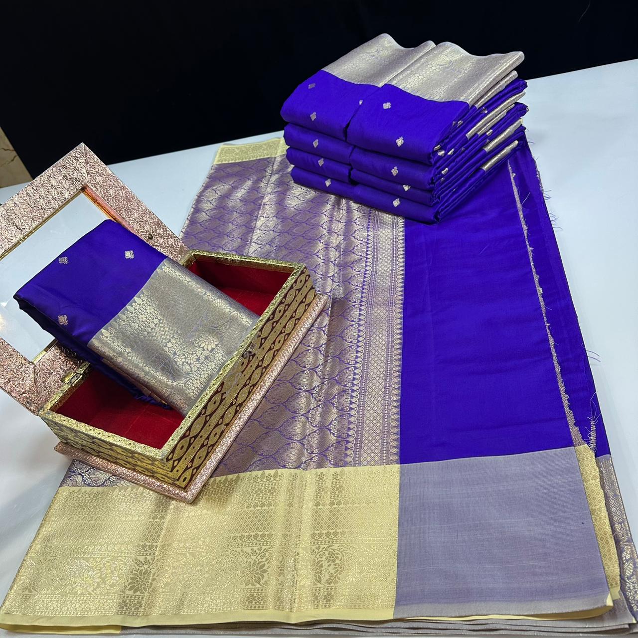 Presenting you all the super soft lightweight Banarasi semi-katan inspired saree with traditional khaddi weaving buty and contrast weaving kanchi inspired border and pallu of the saree in rich weaving brocade
