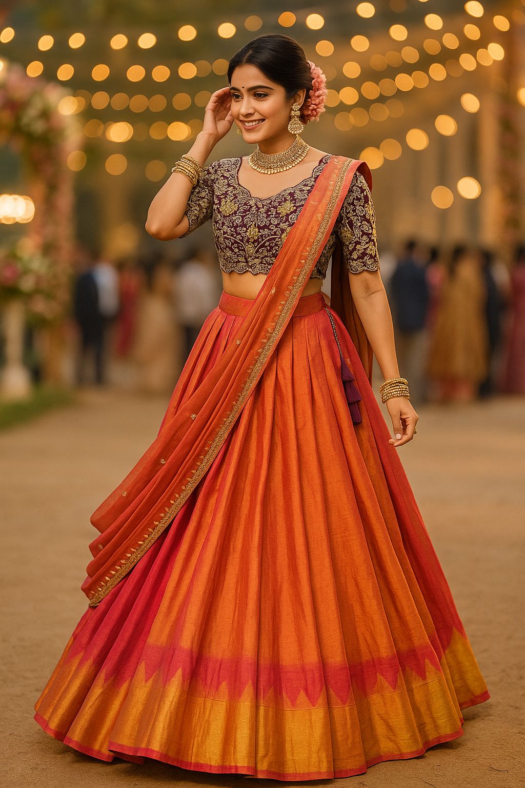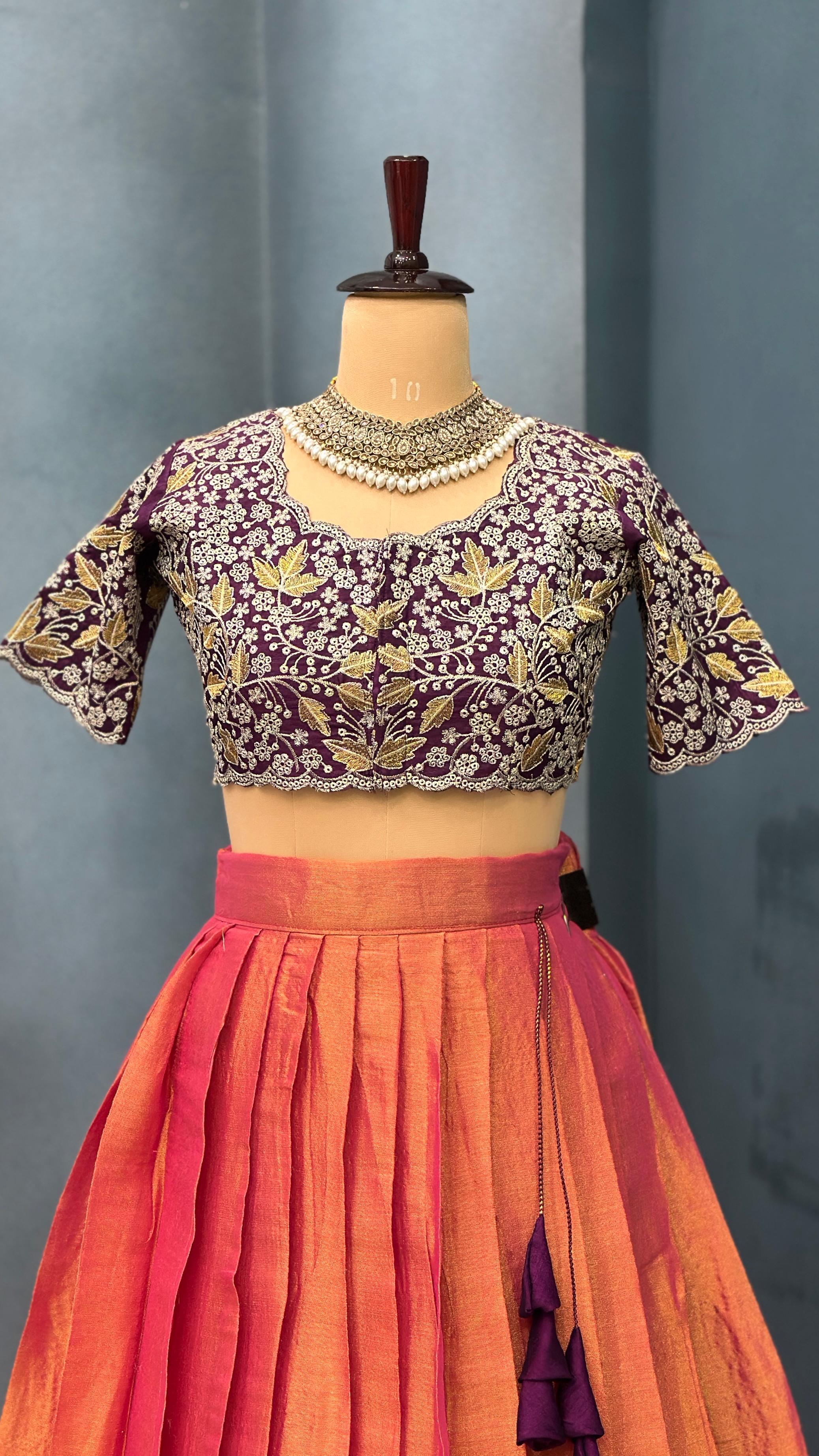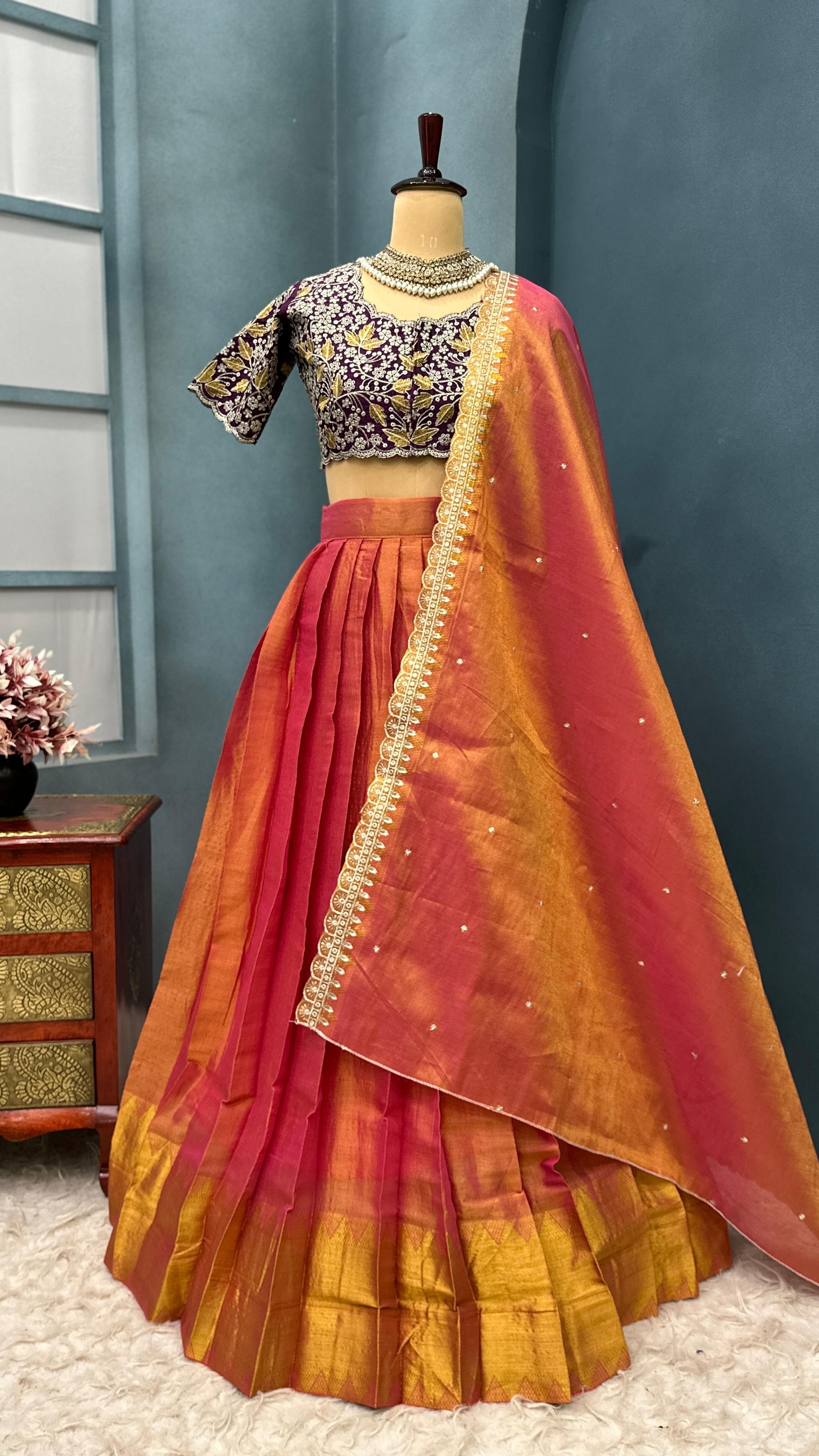 This ensemble is a fusion of vibrant South Indian textile tradition with embroidery finesse. The contrast of the orange-pink lehenga with the wine embroidered blouse creates a striking visual balance. The outfit is festive, regal, and perfect for occasions like weddings, sangeet, festive pujas, or receptions.