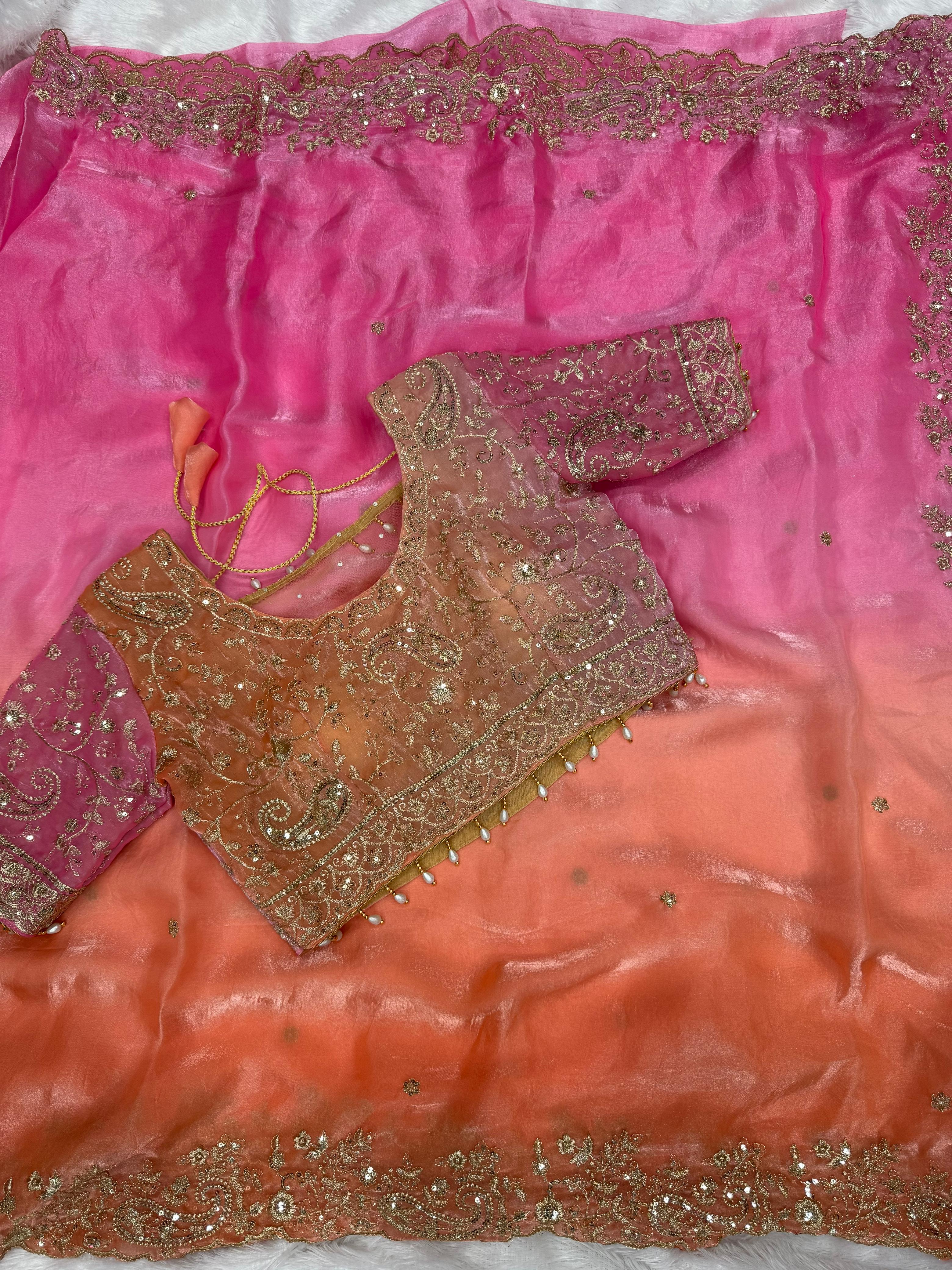 Very soft & elegant rich look fendy sartin fabric with beautiful embroidery 3 mm sequence work heavy border with buttis in all over saree aarco